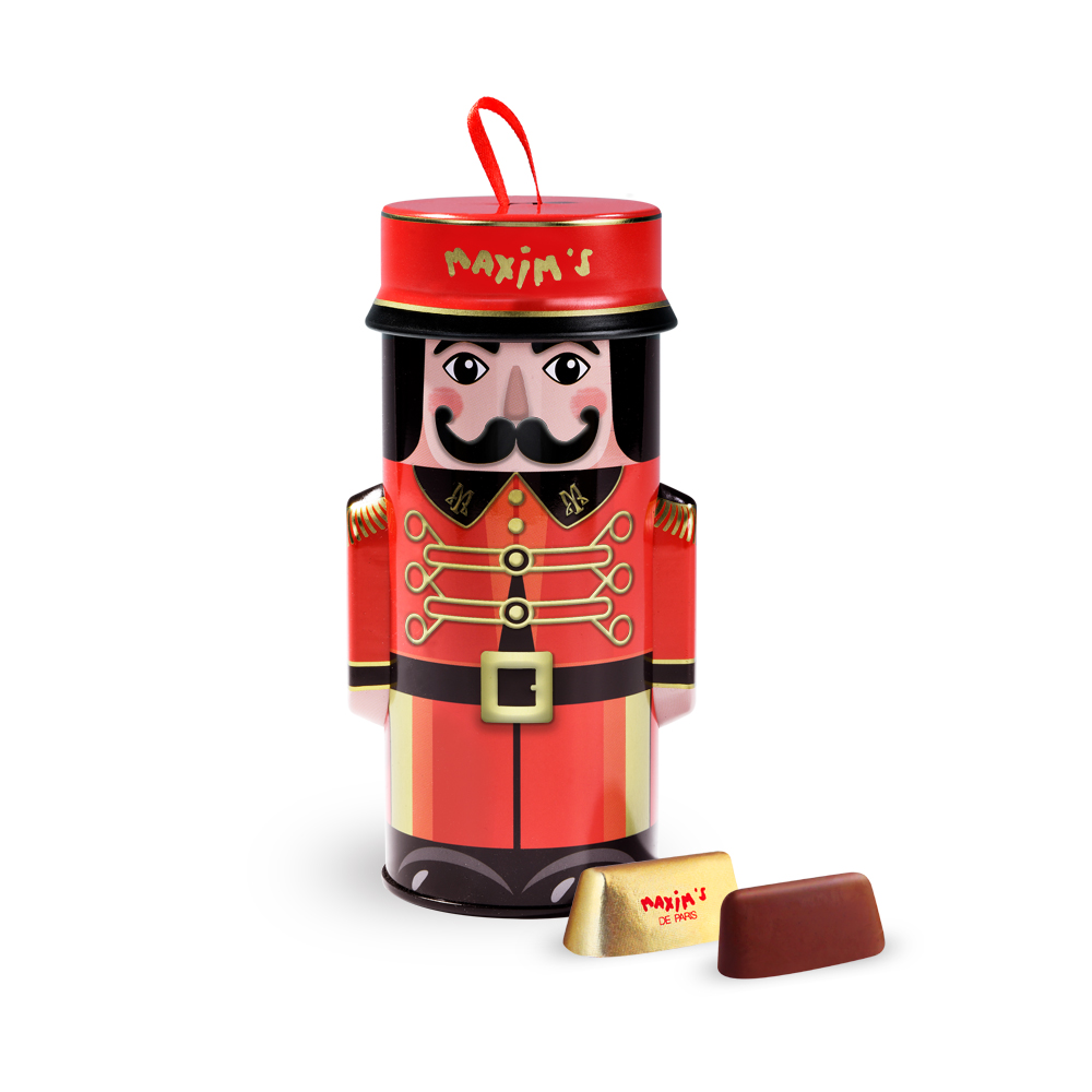 Dekorácia inšpirovaná tradičným „Luskáčikom“, ktorá krásne vynikne na vašom vianočnom stole alebo zavesená na stromčeku. V tejto nádhernej plechovej dóze sa ukrýva 10 lahodných gianduja čokolád, ktoré sa rozplývajú na jazyku.